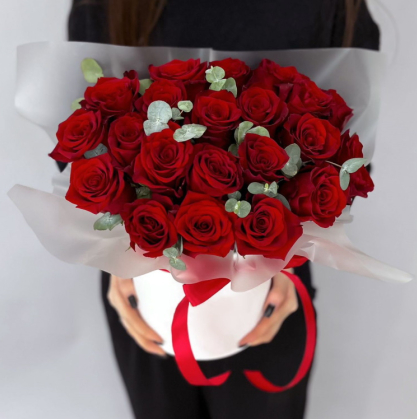Шляпная коробка с красными розами и эвкалиптом